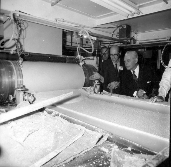 Precision in action: Prime Minister Sir Keith Holyoake tests the batch consistency as the Factory Manager observes during the 1971 opening of the Winstone Wallboards Ltd Auckland Branch.